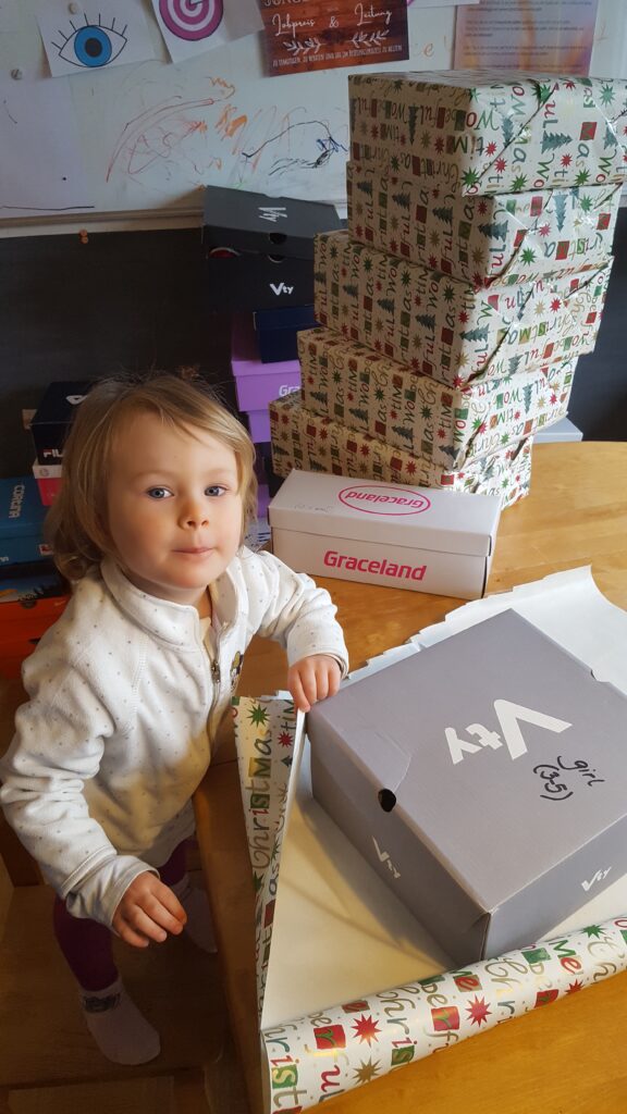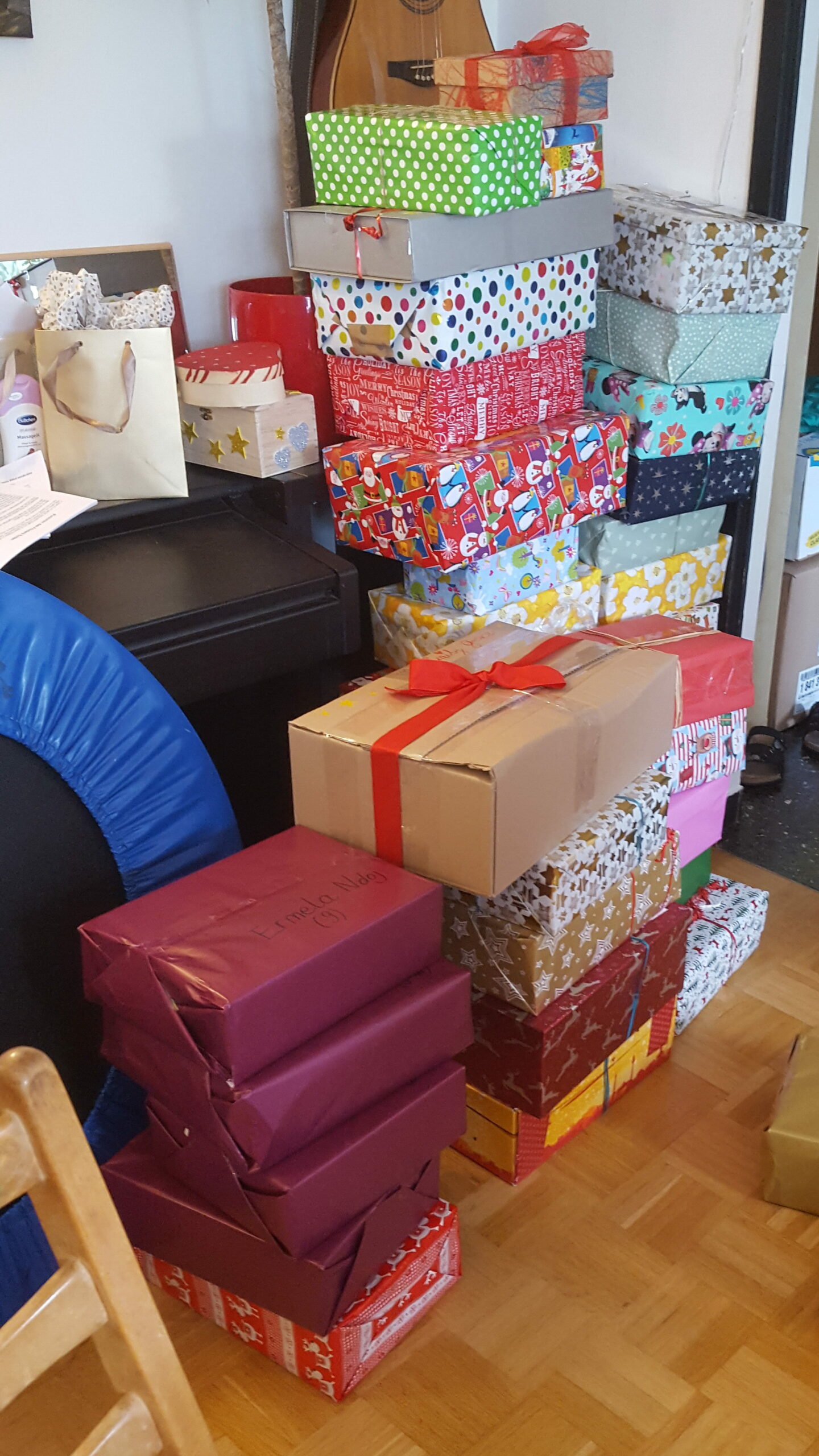 Vielen Dank, ihr seid wirklich super. Es wurden richtig viele Pakete bei uns abgegeben und viele haben auch Geld und Geschenke gespendet, sodass wir selbst viele Pakete packen konnten. Gerade sind wir dabei, die letzten davon mit Geschenkpapier und Schleifen zu verschönern.